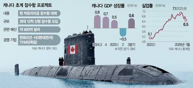 캐나다 정부의 이 같은 움직임은 안보 환경 변화와 경기 둔화에 대한 우려를 불식하기 위한 것으로 풀이된다. 캐나다는 세계에서 가장 긴 해안선을 보유한 국가로 대서양·태평양·북극 등 3대 해역에서 상시 감시와 대응이 가능한 수중 전력이 필수적이다. 특히 트럼프 2기 출범 이후 고율 관세 부과와 보호무역 기조 강화로 캐나다 제조업 전반이 직격탄을 맞고 있는 상황에서 이번 사업을 계기로 산업 기반을 동시에 보강하려는 계산이 깔려 있다. 실제 캐나다의 경제성장률은 1% 미만에 머물러 있고 실업률도 6%대를 기록 중이다. 캐나다 국방협회연구소 연구원인 자비에르 델가도는 “카니 총리는 이번 입찰 경쟁을 캐나다에 보기 드문 기회로 활용하고 있다”며 “이는 말 그대로 ‘카니판 거래의 기술’”이라고 평가했다.