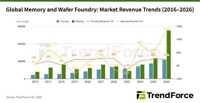 [이데일리 송재민 기자] 인공지능(AI) 확산에 따른 수요 급증으로 올해 글로벌 메모리 반도체 시장 매출이 5500억달러를 넘어 파운드리 시장의 두 배 이상으로 확대될 것이라는 전망이 나왔다. 서버 중심의 고성능 컴퓨팅 투자와 공급 제약이 맞물리면서 메모리 산업이 반도체 시장 성장을 주도하는 양상이다.