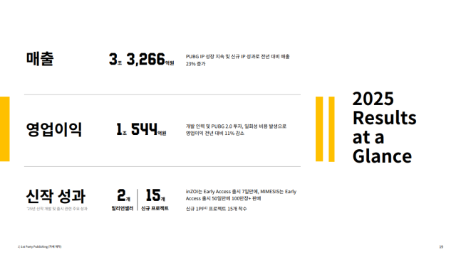 [디지털데일리 이학범기자] 크래프톤이 '펍지' 프랜차이즈의 견조한 성장에 힘입어 지난 2025년 연간 매출 3조원을 돌파하며 창사 이래 최대 실적을 기록했다. 크래프톤은 향후 펍지 지식재산권(IP)을 고도화하는 한편, 인공지능(AI)과 인접 사업 확장을 통해 신규 성장 동력을 확보할 방침이다.