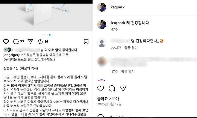 지난해 3월, '장범준 4집(찌질의 역사)' 발매 당시 장범준이 남긴 글도 다시 회자되고 있다. 그는 개인 계정에 앨범 사진과 함께 "경구의 건강을 기원하며 누나도 이 앨범에 함께 보냅니다"라고 적었고, 당시 박경구는 "저 건강합니다"라고 답했다. 부고가 전해진 뒤 팬들은 해당 게시물에 "형, 건강하다면서…", "진짜 아팠던 건 아니었을까"라며 애도의 마음을 전했다.