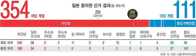 헌법 개정에 찬성하는 자민당과 일본유신회, 국민민주당, 참정당 등의 의석수를 합하면 395석으로, 중의원 개헌안 발의선인 전체 의석 3분의 2(310석)를 훌쩍 뛰어넘는다. 자민당은 자체 의석인 316석만으로도 개헌안을 발의할 수 있다. 다만 개헌을 실현하려면 참의원에서도 3분의 2 의석을 확보해야 하는데, 현재 자민당·일본유신회의 의석은 과반에서 5석이 모자란 상태다.