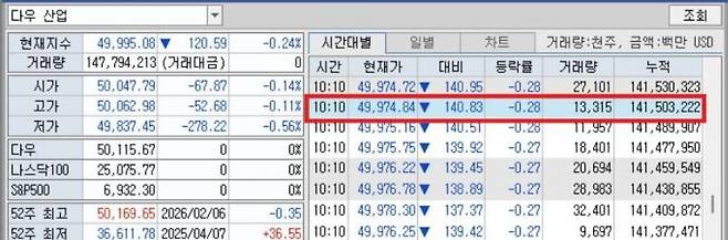이날 뉴욕 주식시장에서 오전 10시10분 현재 블루칩 중심의 다우존스30산업평균지수는 전 거래일 대비 140.83포인트(-0.28%) 하락한 4만9974.84를 기록 중이다. 대형주 중심의 S&P500지수는 15.04포인트(-0.22%) 하락한 6917.26에 출발했으나, 이내 반등해 4.66포인트(+0.06%) 오른 6936.96에 거래 중이다. 기술주 중심의 나스닥지수는 68.84포인트(+0.29%) 오른 2만3100.06을 가리키고 있다.