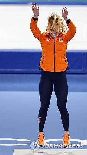 epa12720836 Jutta Leerdam of the Netherlands gestures on the podium of the Women's 1000m of the Speed Skating competitions at the Milano Cortina 2026 Winter Olympic Games, in Milan, Italy, 09 February 2026. EPA/ROBERT GHEMENT