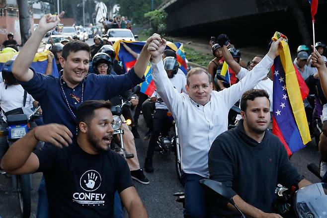 8일 베네수엘라 수도 카라카스에서 이날 석방된 야권 지도자 후안 파블로 과니파(오른쪽 흰옷 입은 사람)와 헤수스 아르마스(왼쪽 남색 반팔 옷 입은 사람)가 시민들과 도심을 행진하고 있다. 두 사람을 포함해 니콜라스 마두로 대통령 시절 핍박받았던 많은 정치인들이 이날 풀려났다. 마두로 대통령은 지난달 3일 미국에 의해 축출됐다.