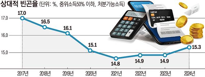 상대적 빈곤율은 균등화 처분가능소득(실제 생활에 쓰는 돈)이 중윗값의 절반 미만인 인구 비율이다. 국민의 전반적인 소득수준은 과거보다 개선됐지만 저출산·고령화로 소득이 상대적으로 저평가되는 1·2인 가구가 늘면서 통계상 빈곤인구가 늘고, 이는 빈곤율 상승으로 이어졌다. 특히 빈곤율은 2021년까지 꾸준히 하락하다가 이듬해부터 상승 전환됐는데 2020~2023년에는 코로나19 사태로 혼인·출산이 급감했다. 가구구성 변화에 따른 빈곤율 왜곡도 이 시기에 두드러졌다.