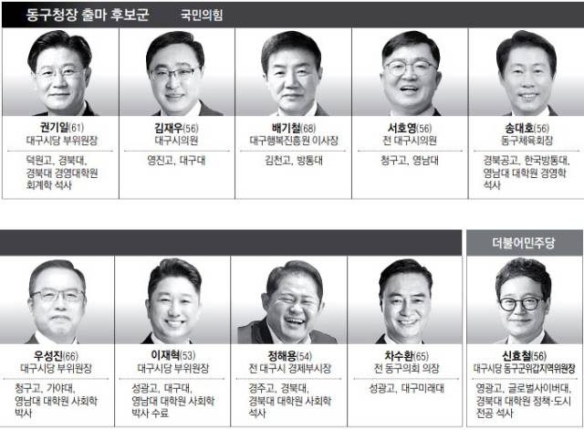 동구청장 선거는 다양한 커리어를 자랑하는 도전자들 간 누가 경선 진출에서 유리한 고지를 밟나 관심이 쏠린다. 전직 구청장과 전·현직 시의원, 대구시 경제부시장, 기업인 출신 등이 선거전에 뛰어들었다.