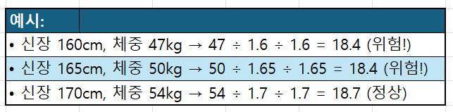 두 번째 질문은 BMI(Body Mass Index, 체질량지수)다. 계산법은 간단하다. 체중(kg)을 신장(m)으로 두 번 나누면 된다.