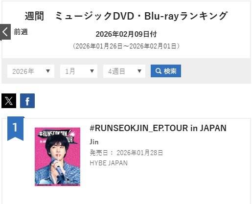 방탄소년단(BTS) 진이 일본 음악 시장에서 다시 한번 존재감을 각인시켰다. 일본 오리콘이 2월 5일 발표한 ‘오리콘 주간 영상 차트’에 따르면, 진의 솔로 콘서트 실황을 담은 블루레이 ‘#RUNSEOKJIN_EP.TOUR in JAPAN’이 1위를 기록했다. 오리콘은 공식 홈페이지를 통해 ‘BTS 진 첫 솔로 콘서트 뮤직 DVD·BD 랭킹 1위’라는 제목으로 해당 소식을 전했다.