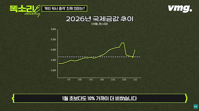 이게 뭘 말해주느냐? 케빈 워시의 깜짝 지명은 차익을 한 번 실현하고 갈 핑계를 찾고 있던 자산 쪽에 그 핑곗거리가 돼준 측면이 더 크다는 겁니다. 금값은 지난 주말에 최저점에서도 1월 초보다도 10% 가까이 더 비쌌습니다.