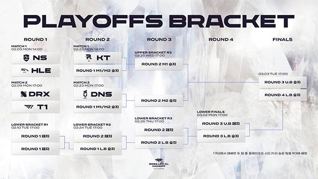2026 LCK CL 킥오프 플레이오프는 9일(월)부터 WDG 스튜디오 홍대(서울 마포)에서 오프라인으로 진행된다. 오후 2시에는 농심 레드포스와 한화생명e스포츠가, 오후 5시에는 디알엑스와 티원 이스포츠 아카데미가 맞대결을 펼친다. 플레이오프의 대미를 장식할 결승전은 오는 3월 3일(화) 열린다.
