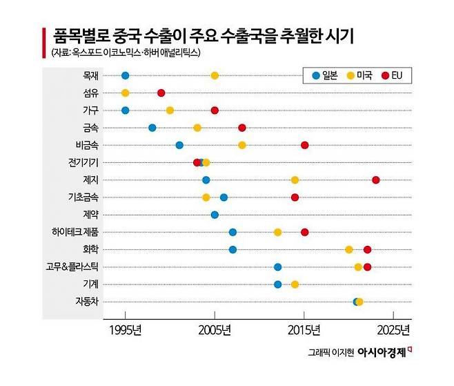 아래는 중국 수출이 미국, 유럽연합(EU), 일본 등 주요 수출국들을 추월한 시기를 보여주는 그래픽이다.