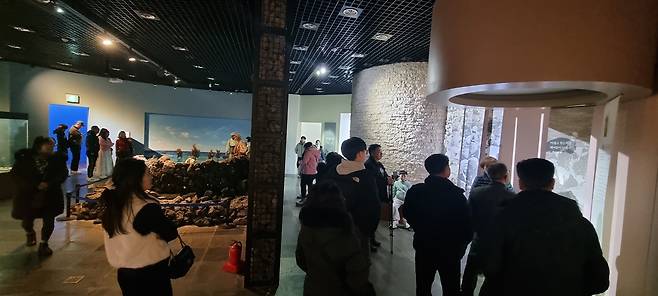 | ▲ 해녀박물관 전시실 해녀박물관을 찾은 관람객들이 문화관광해설사의 설명을 듣고 있다. |