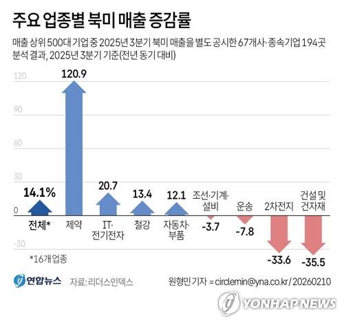 (서울=연합뉴스) 원형민 기자 = 10일 기업분석연구소 리더스인덱스가 매출 상위 500대 기업 가운데 작년 3분기 북미 매출을 별도 공시한 67개사와 종속기업 194곳을 분석한 결과, 북미 매출은 2024년 3분기 대비 14.1% 늘어난 343조7천985억원으로 집계됐다.