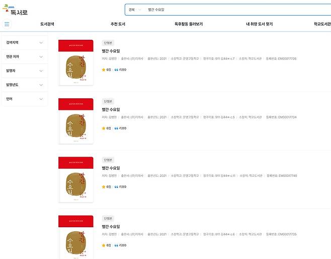 10일 <오마이뉴스>가 학교도서관관리시스템인 '독서로'에서 확인해 보니, 위안부 피해자 모욕 행위를 해온 김병헌씨가 낸 책 <빨간 수요일> 을 학교 도서관에 비치하고 있는 학교가 대구, 인천, 대전, 경기, 충북, 경북, 경남 등 7개 교육청 소속 11개교에 이르는 것으로 나타났다. 비치된 책은 모두 16권이었다.