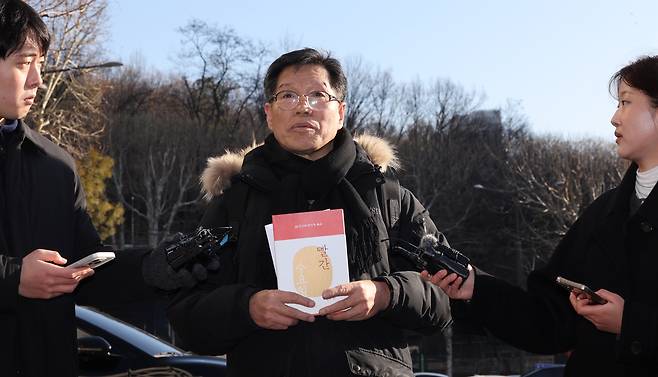 | ▲ 일본군 '위안부' 피해자를 모욕하는 시위를 벌여온 혐의를 받는 김병헌 위안부법폐지국민행동 대표가 3일 서울 서초경찰서에 피의자 신분으로 출석하며 자신이 쓴 '빨간 수요일'이란 책을 들고 취재진의 질문에 답하고 있다. |