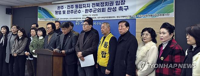 (전주=연합뉴스) 김동철 기자 = 전주시 주민자치협의회와 통장연합회, 새마을회 등 전주시 자생단체 회원들이 10일 전주시청에서 기자회견을 열고 "안호영 국회의원 등 전북 정치권 주요 인사들이 전주·완주 통합에 대해 공개적으로 찬성 입장을 밝힌 데 대해 전주시민의 이름으로 환영한다"고 밝히고 있다. 회견에는 8개 단체가 참여했다. 2026.2.10