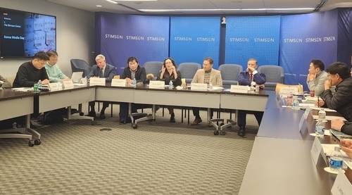 [미국 싱크탱크인 스팀슨센터가 9일(현지시간) 워싱턴DC의 센터 사무실에서 한국 특파원단과 '한국 언론의 날' 행사를 하고 있다. (워싱턴=연합뉴스)]