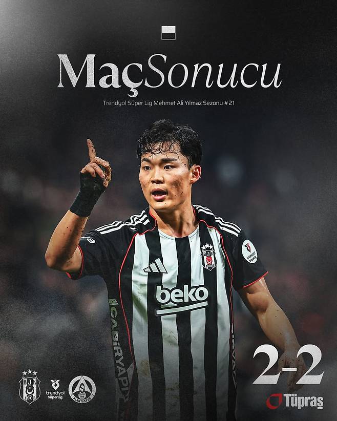 베식타시는 9일(한국시간) 튀르키예 이스탄불의 튀프라쉬 스타디움에서 열린 알란야스포르와 2025/26 쉬페르리그 21라운드 홈 경기에서 2-2로 비기며 5위(10승 7무 4패·승점 37)에 자리했다.