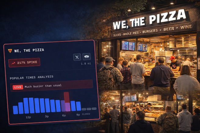 해외 온라인 매체와 소셜미디어 추적 계정들에 따르면 7~8일(현지시간) 전후, 펜타곤 반경 1마일(약 1.6㎞) 이내에 위치한 피자 매장들의 주문량과 혼잡도가 평소보다 크게 증가했다. 일부 매장은 활동량이 최대 250%까지 치솟았고, 다른 매장들도 140~150% 수준의 증가율을 기록했다는 관측이 나왔다.
