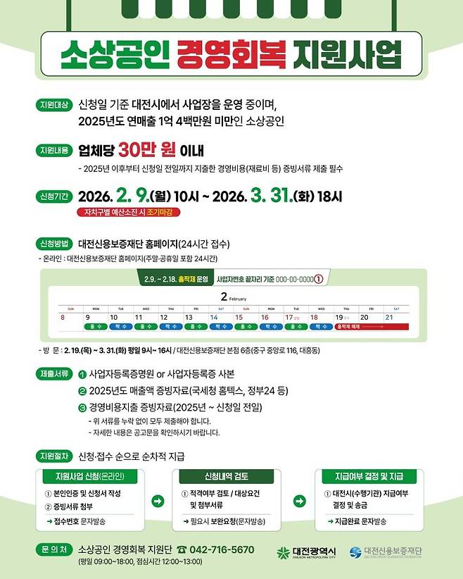 한편 이 사업은 대전신용보증재단 경영회복지원단(042-716-5670)에서 진행하며, '대전시 소상공인 지원정보' 밴드에서 보다 자세한 내용을 확인할 수 있다.