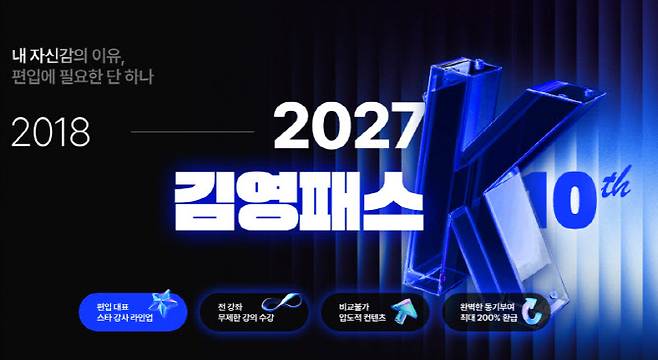이 가운데 메가스터디교육 김영편입은 2027학년도 대학 편입 대비 ‘2027 김영패스’를 운영한다고 10일 밝혔다. 2027 김영패스는 오는 2027년 1월 31일까지 김영편입의 2027 대비 편입영어·수학 전 강좌를 무제한 반복 수강할 수 있는 패스 상품이다.