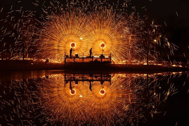 [베이징=AP/뉴시스] 9일(현지 시간) 중국 베이징에서 춘제(春節·중국 설)를 앞두고 전통 ‘타철화'(打鐵花)공연이 펼쳐지고 있다. 2026.02.10.
