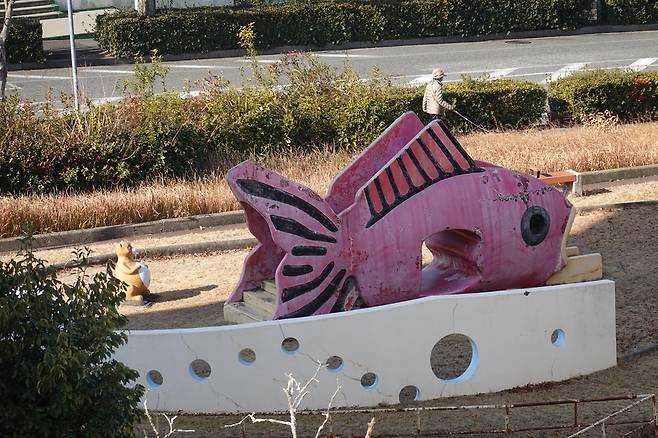 | ▲ 2026년 2월 1일 일본 효고현 고베시 니시구의 시영 사카에주택단지에 방치된 놀이터 뒤로 노인이 산책하고 있다. |