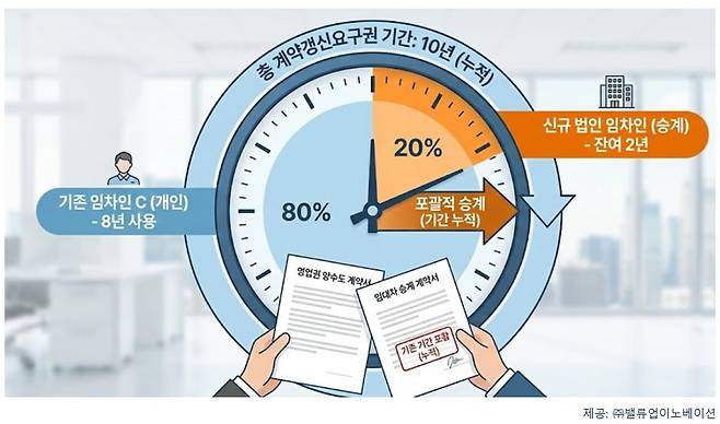 개인사업자였던 임차인 C가 8년 차에 법인으로 전환하며 임대인의 동의를 얻어 승계 계약을 맺었다고 가정해 보겠습니다. 이때 임대인이 “기존 기간을 포함한다”는 조건을 명확히 했다면 법인 임차인에게 남은 갱신요구권은 새로운 10년이 아닌 ‘잔여 2년’뿐입니다.