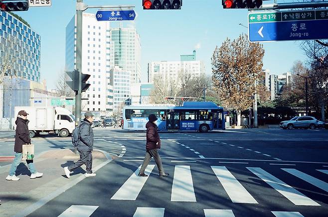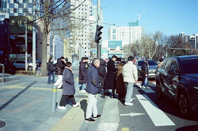 1월의 중순을 넘어가는 서울, 영하의 기온, 회색빛 건물들. 500T가 만들어내는 차가우면서도 진득한 색감은 이 도시를 한 편의 누아르 영화처럼 만들어줄 것이 분명했다. 디지털 센서로는 흉내 내기 어려운, 필름 특유의 관용도와 그레인(Grain)은 차가운 도시의 표면 위에 따뜻한 질감을 덧입혀주었다. 셔터를 누를 때마다 눈앞의 현실은 아주 조금씩 지연되어, 필름 위에서 '시네마'가 되었다.