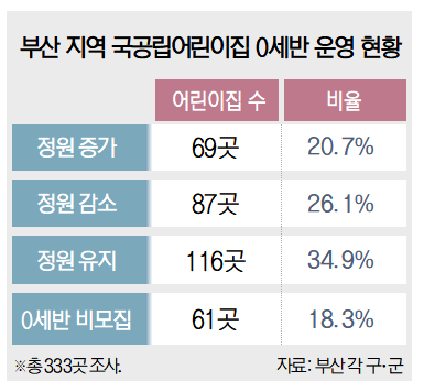 부산 지역 국공립어린이집 절반가량이 0세반(2025년 출생) 정원을 기존보다 줄이거나 0세 원아를 뽑지 않는 것으로 나타났다. 정부가 보육의 질을 높이기 위해 올해부터 0세반 교사의 담당 원아 비율을 줄였는데, 어린이집이 예산 사정상 추가 교사 고용을 하지 않으면서 어린이집 ‘대기 행렬’ 증가와 원아 모집 감소라는 역효과로 이어졌다는 지적이 나온다.