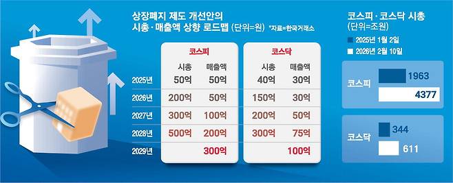 당국은 남아 있는 시총 상향폭을 계획보다 이른 시점에 반영하는 동시에 기준선 자체를 더 높이는 방안도 함께 논의하고 있다. 제도 개선안 발표 이후 코스피와 전체 시총이 두 배 이상 확대됐고 코스닥 시총도 80% 가까이 늘어난 만큼 '오천피 시대'에 걸맞은 상장폐지 기준이 필요하다는 판단이다. 매출액 요건은 시총처럼 적용 시점을 앞당기기보다 기준 자체를 높이는 방향이 유력하게 거론된다.