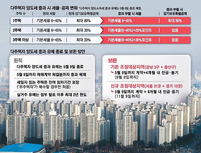 우선 정부는 양도세 중과 배제가 적용되는 계약 체결일과 잔금일을 차등화했다. 강남 3구와 용산구 등 지난해 10·15 대책 이전부터 조정대상지역이었던 곳은 5월 9일까지 계약을 체결하고 4개월 이내인 9월 9일까지 잔금을 치러야 중과 배제 혜택을 받는다. 당초 정부는 3개월 유예를 검토했으나 부동산 거래 특수성을 감안해 기간을 한 달 더 늘렸다. 지난해 10·15 대책으로 새롭게 묶인 나머지 서울 21개 자치구와 경기 12개 지역 등은 6개월의 유예기간을 부여받아 11월 9일까지 잔금을 마무리하면 된다.