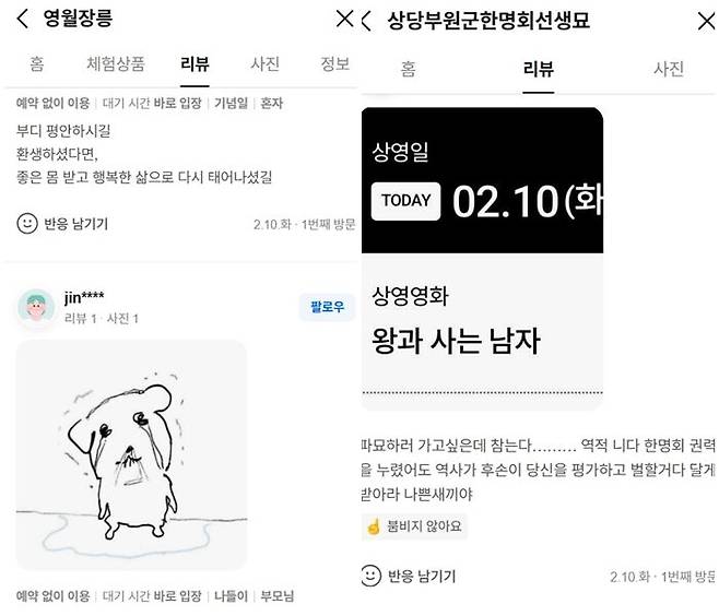 영화를 본 관객들은 포털사이트나 영화 커뮤니티에 후기를 남기는데 그치지 않고 단종의 묘인 장릉과 세조의 묘인 광릉, 한명회의 묘역인 상당부원군한명회선생묘 리뷰 페이지에 감정을 담은 리뷰를 기록하고 있다.