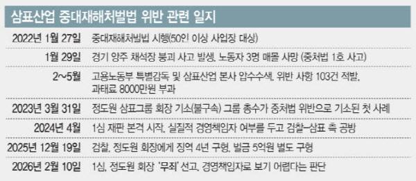 검찰은 2022년 1월 29일 삼표산업 양주 사업소에서 작업 중이던 근로자 3명이 토사에 매몰돼 사망한 사고와 관련해 중처법 규정상 실질적이고 최종적 권한을 행사하는 경영책임자가 정 회장인 것으로 판단해 기소했지만 법원이 정 회장에 대해 무죄를 선고하면서 향후 중처법 실효성에 대한 논란도 이어질 전망이다.