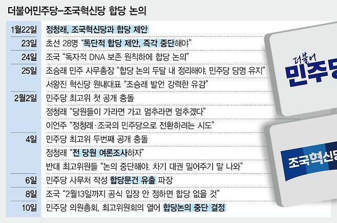 조국혁신당을 향한 정청래 더불어민주당 대표의 기습적인 합당 제안(1월22일)부터 10일 민주당 의원총회에서 ‘합당 연기’로 가닥이 잡히기까지, ‘혼돈의 19일’을 집약하는 말은 ‘권력투쟁’이다.