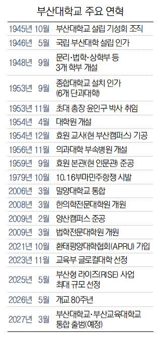 부산대학교의 역사는 지역민의 헌금에서 출발한 교육구국의 기록이다. 1946년 국내 최초의 종합 국립대학으로 문을 연 부산대는 산업화와 민주화의 굽이마다 국가 거점 국립대학으로서 역할을 수행해 왔다. 2026년 개교 80주년을 맞은 부산대는 ‘명문 부산대’로의 재도약을 선언하며 다음 100년을 향한 담대한 여정을 이어간다.