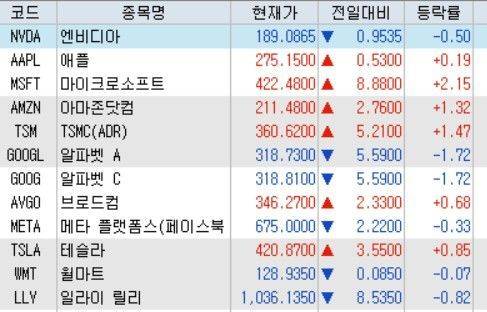 미국 주식 시가총액 상위 종목을 보면 애플 +0.19%, 아마존닷컴 +1.32%, TSMC +1.47% 등이 상승세다. 반면 엔비디아 -0.50%, 알파벳(A, C) -1.72%, 메타 -0.33%, 월마트 -0.07%, 일라이릴리 -0.82% 등은 하락 중이다.