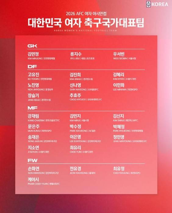 축구협회는 신상우 감독이 이끄는 여자 대표팀이 참가 예정인 2026 아시아축구연맹(AFC) 여자 아시안컵 참가 명단을 10일 공식 발표했다.