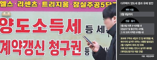또한 정부는 매수자의 의무 거주 유예 규정을 이달 12일을 기산일로 해 최대 2년까지 적용하기로 했다. 정부가 12일 세법 시행령을 공식 발표하는 데 따른 조치다. 5월 9일 전 새로운 세입자를 받아 규제를 회피하는 꼼수를 막기 위한 조치로 해석된다.