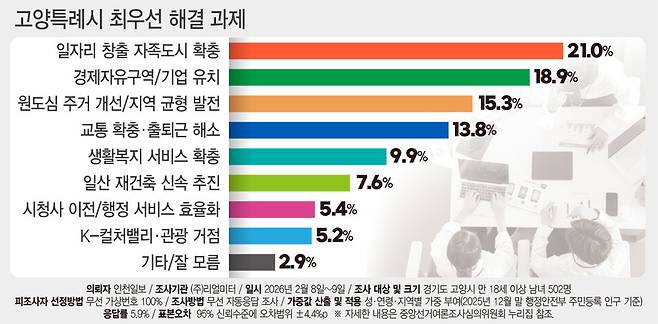 10일 인천일보가 리얼미터에 의뢰해 실시한 여론조사 결과, '앞으로 고양시가 가장 우선적으로 해결해야 할 현안은 무엇이라고 생각하느냐'는 질문에 '일자리 창출·자족도시 기반 확충'(21.0%)과 '경제자유구역 지정·기업 유치'(18.9%)라는 응답이 1·2위를 차지했다. 두 항목을 합한 비율은 40%에 육박했다. 베드타운이라는 이미지에서 벗어나 자립적인 경제 구조를 갖춘 도시로 전환하길 바라는 시민 인식이 반영된 결과로 풀이된다.