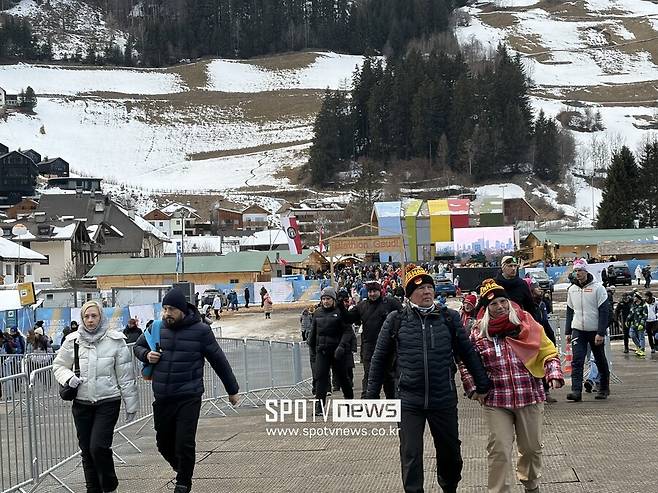 설원으로 이어진 관중석은 이미 만원에 가까웠고, 각국 국기가 뒤섞인 응원 깃발이 바람에 흔들렸다.
