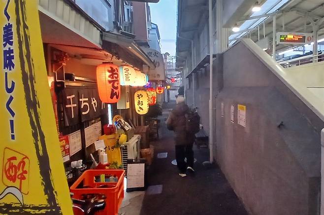 | ▲ 전철역 담과 맞붙은 선술집 한큐선 이시바시한다이마에 전철역 담과 맞붙은 선술집. 가게 내부는 서서 마시는 공간이 전부다. |