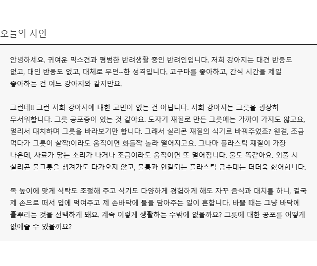 사연 속 반려견은 전반적으로 무던한 성격이고, 간식도 잘 먹고, 식욕도 분명합니다. 그런데 도자기 그릇은 멀리서 대치, 실리콘은 살짝 움직이면 화들짝, 플라스틱도 역시 소리가 나면 다시 거리를 두는 모습이에요. 물그릇까지 포함해서 그릇이라는 물건 자체에 공포를 느끼는 상황입니다. 결국 보호자의 손이 출동하고, '손바닥 급여 → 바닥에 흩뿌리기 → 이렇게 사는 수밖에 없나…'라는 고민으로 이어지죠.