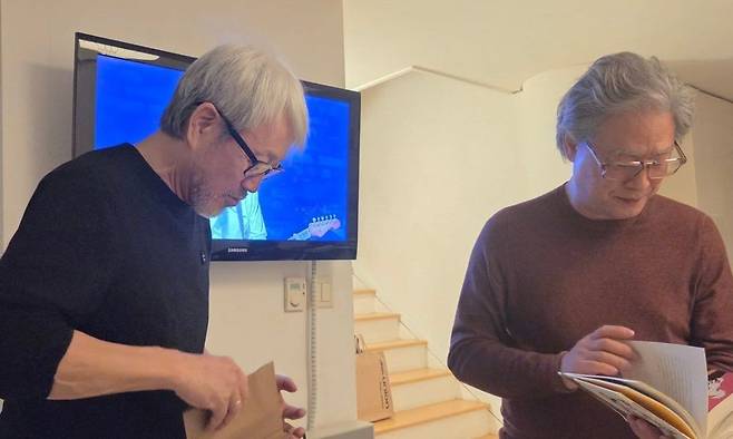 공개된 사진 속 박찬욱 감독은 편안한 일상복 차림으로 이승신의 거실 소파에 앉아 여유롭게 책을 살피거나 담소를 나누고 있다.