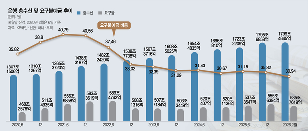 증시 호황과 종합자산관리계좌(IMA) 등장에 은행의 핵심 저원가성 자금인 요구불예금이 총수신에서 차지하는 비중이 30% 아래로 내려앉았다. 요구불예금 비중은 코로나19 이후에도 한때 40%를 웃돌았지만 머니 무브와 함께 20%대 수치가 굳어지고 있다.