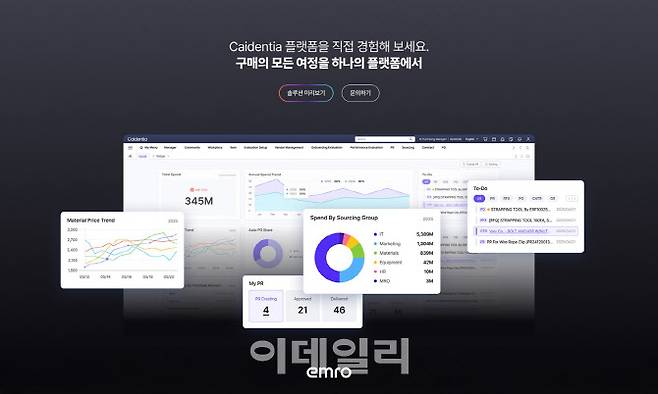 홈페이지 상단의 ‘솔루션 미리보기’ 메뉴를 선택하면 구매 요청, 입찰, 계약, 발주·입고·송장·세금계산서 발행 등 ‘케이던시아(Caidentia)’를 활용한 구매 프로세스를 직접 체험 가능하다. 구매 담당자와 협력사 별로 구분된 데모를 제공해 고객들이 엠로의 구매 솔루션을 보다 쉽게 이해할 수 있도록 돕는다.