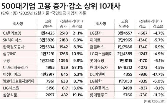 고용을 가장 많이 늘린 기업은 CJ올리브영으로 2518명(21.1%) 증가했다. CJ올리브영은 K뷰티 시장 성장에 따른 브랜드 수요 증가와 점포 확대로 매장과 인력을 크게 늘렸다.