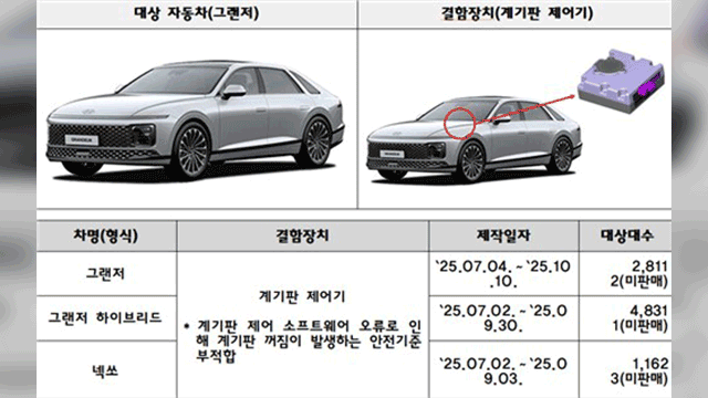 그랜저·쏘나타 등 20개 차종 3만 9,148대는 계기판 제어 소프트웨어 오류로 계기판이 꺼지는 안전기준 부적합 사항이 확인돼 오늘(11일)부터 시정조치를 진행합니다.