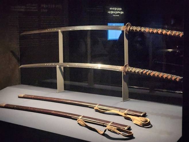 | ▲ 이순신 장군의 기개와 정신을 상징하는 국보 156호 '이순신 장검'. 장군의 시구가 새겨있다. "삼척서천 산하동색 (三尺誓天 山河動色)" (석 자 칼로 하늘에 맹세하니 산과 강이 떨고), "일휘소탕 혈염산하 (一揮掃蕩 血染山河)" (한 번 휘둘러 쓸어버리니 피가 강산을 물들인다) |