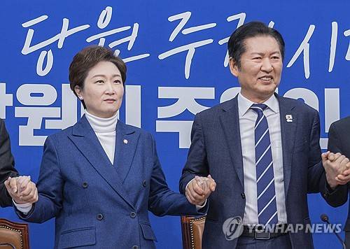 앞서 발언한 정청래 대표 역시 "우리 안의 작은 차이를 넘어 이제 오직 지방선거 승리를 위해 우리의 큰 같음을 바탕으로 총단결하겠다'며 "비 온 뒤 땅이 굳는다고 이제 이를 전화위복의 기회로 삼아 지방선거 승리에 올인하겠다"고 했다.